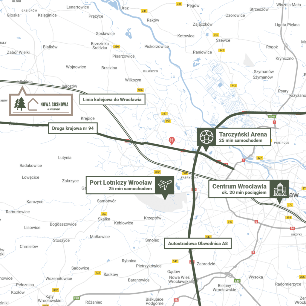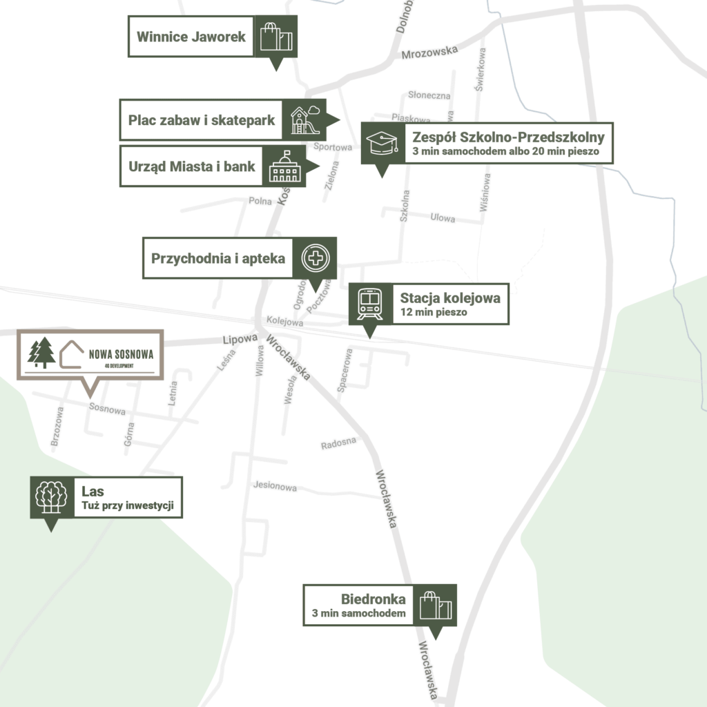 Inwestycja zlokalizowana jest w Miękini przy ul. Sosnowej, graniczącej z urokliwym lasem. Jest tutaj cicho, spokojnie i bezpiecznie. Nie brakuje miejsc na długie spacery lub rowerowe wycieczki. Blisko również do pełnej infrastruktury miasta – sklepów, punktów usługowych, przychodni, przedszkoli i szkół. Zwiń ∧