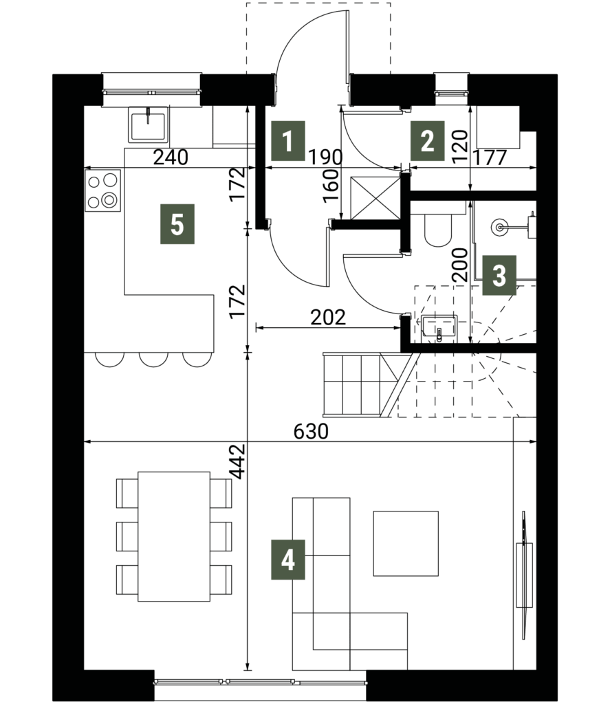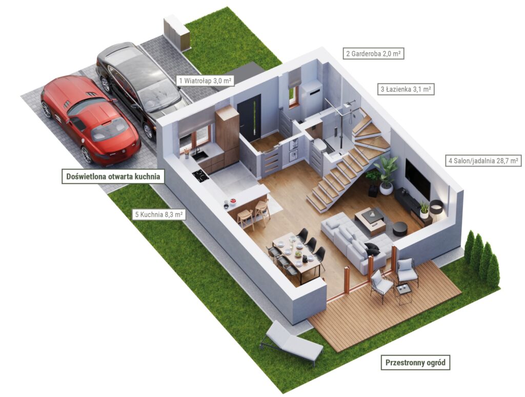 Parter to komfortowa otwarta strefa dzienna z salonem, jadalnią i otwartą kuchnią, a ponadto toaleta oraz pomieszczenie techniczne. Piętro (bez skosów) to 3 sypialnie i druga łazienka. Dostępne jest również poddasze do dowolnej aranżacji.
