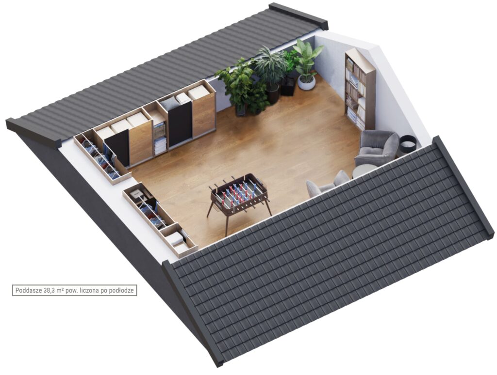 | 1 | Poddasze (pow. liczona po podłodze) | 38.3 m2 |